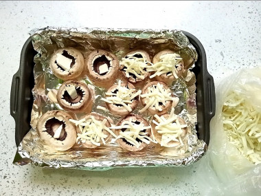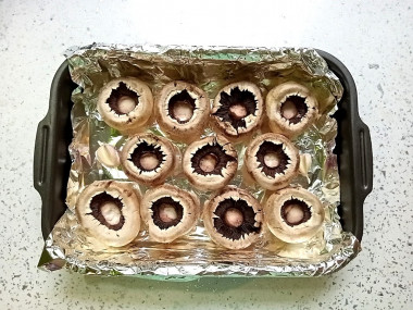 В керамическую форму для запекания или на застеленный фольгой противень выложить шляпки грибов.