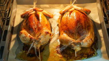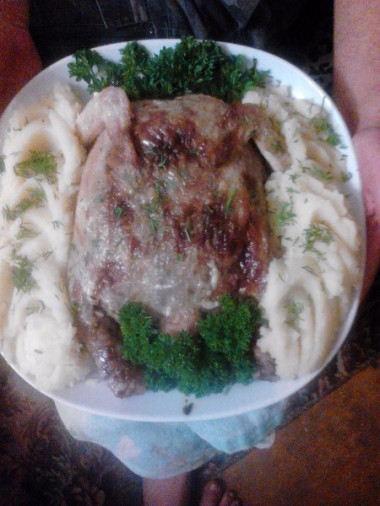 Составляя список блюд на праздничный стол ко Дню рождения, нашла интересный рецепт - курица фаршированная блинами, решила его приготовить. Готовила сразу две курицы, каждая была весом около 1.5-1.6 кг. Первым делом подготовила куриные тушки, сняв кожу с конечностями. Кожу натерла специями и отложила в сторонку мариноваться, пока я буду печь блины и готовить начинку. В каждую курицу вместилось 10 блинных рулетов. Начинку готовила из репчатого обжаренного лука, куриного мяса, шампиньонов и сыра. Начинив курицу блинами, аккуратно зашила кожу, связала крылышки и голени, чтобы курица имела красивую форму и не расползлась при запекании. Чтобы голени не падали вниз, зафиксировала их деревянной шпажкой. Фаршированных курочек запекала в духовке около часа. Курочки получились румяными и очень аппетитными! Перед подачей к столу освободила курочек от нитей, шпажек и завязок. Фаршированные курочки без внимания гостей не остались, гостям такое необычное блюдо очень понравилось, то и дело, все удивлялись и спрашивали рецепт приготовления! Спасибо автору за рецепт! Очень рекомендую попробовать!