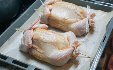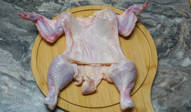 Подготовьте тушку курицы. Курицу лучше брать весом не меньше полутора килограммов, с хорошей целой кожей. Курицу помойте, обсушите бумажным полотенцем. Выложите тушку на спинку, грудкой вверх и начните снимать кожицу, стараясь не повредить ее. Это несложный и недолгий процесс, кожица снимается легко. Большая сложность может возникнуть на спинке — там кожа тоньше. Конечности оставляйте вместе с кожей, перерезая по суставу, сначала надломив его.