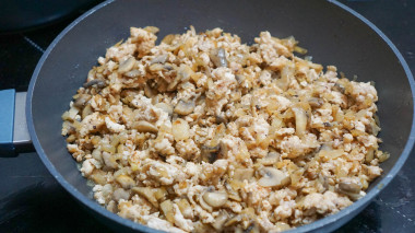 В глубокой посуде смешайте измельченное филе курицы, обжаренные овощи с грибами, натертый сыр, 1-2 столовые ложки майонеза (можно заменить на сметану), соль, перец по вкусу. Все хорошо перемешайте.