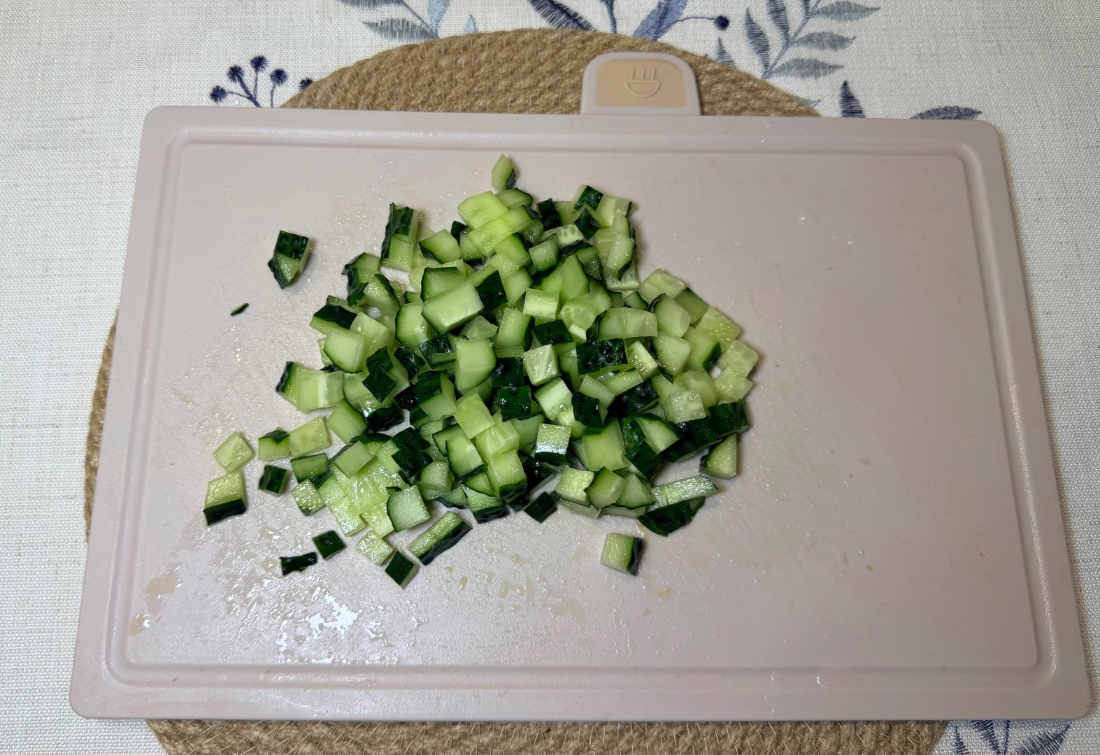 Свежие огурцы хорошо помойте, обсушите. Нарежьте огурцы мелкими кубиками. Кожицу, если она не грубая, не повреждена и не горькая, срезать не нужно.Шаг 6: