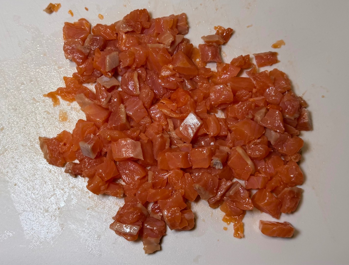 Филе форели освободите от кожи и удалите возможные косточки. Нарежьте рыбу мелкими кубиками.Шаг 4: