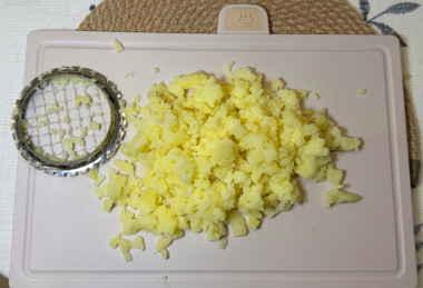 Картофель предварительно отварите до готовности на умеренном огне. Готовность овоща проверьте ножом. Если картофель мягкий и легко протыкается, значит, он сварился. Готовый картофель полностью остудите, очистите от кожуры и нарежьте мелкими кубиками.Шаг 3:
