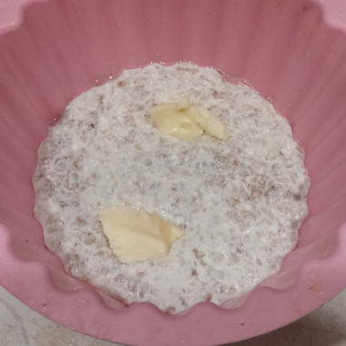 Сверху подготовленной массы выложите кусочками сливочное масло - благодаря ему образуется румяная аппетитная корочка. Форму с крупеником поставьте в предварительно разогретую до 180 гр. духовку на 40 минут или до румяной корочки.