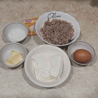 Как готовят крупеник с творогом из гречки? Соберите указанные ингредиенты. Гречку можете отварить заранее или использовать оставшуюся от ужина. Творог я взяла 5%, но могу предположить, что жирность творога не сильно влияет на конечный результат. Если творог суховат, можете добавить сметану. Сахар можете смешать с ванильным сахаром.
