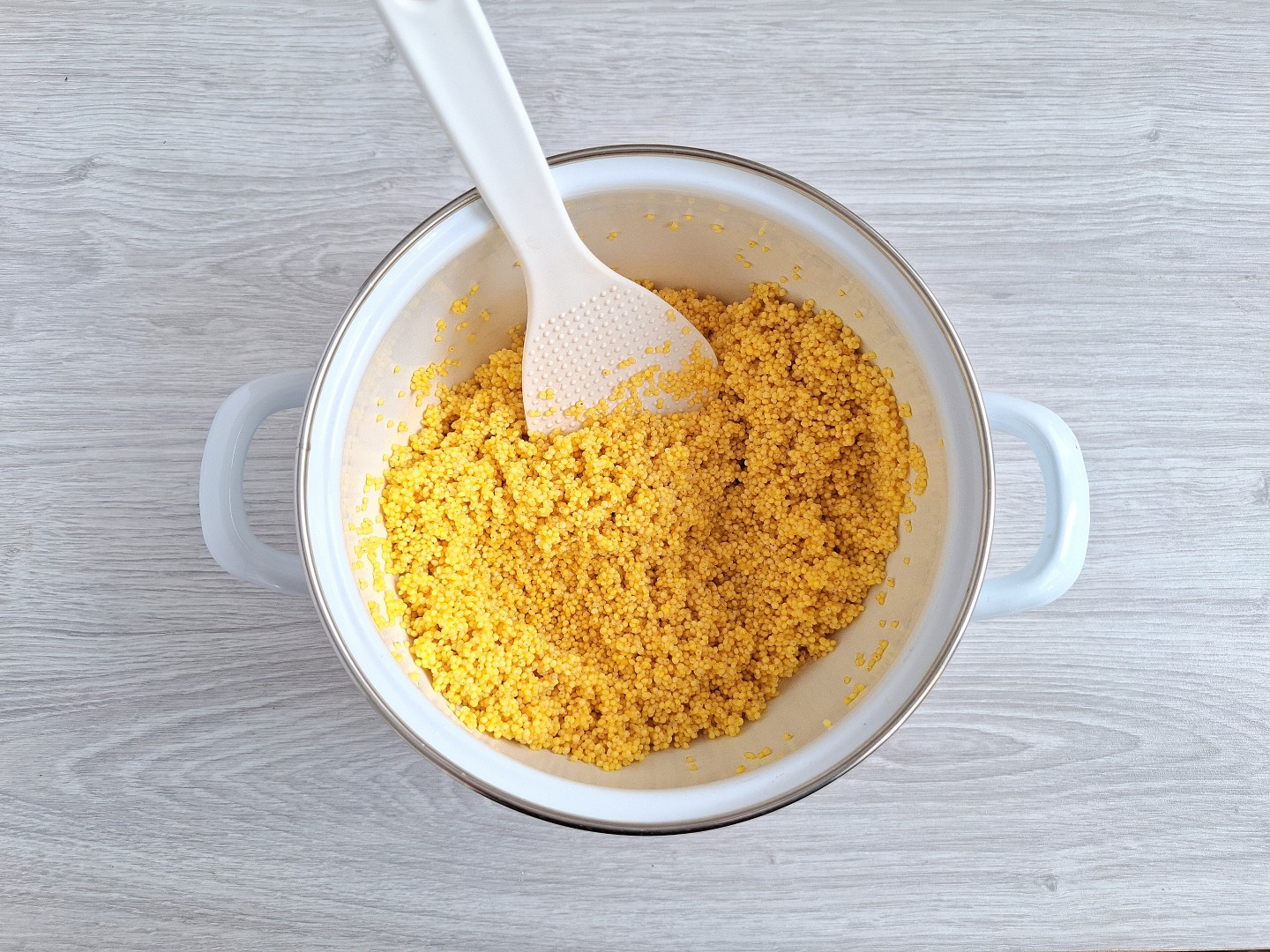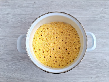 Крупу переберите, удаляя мусор и красные твердые зернышки. Высыпьте пшено в сотейник и хорошенько промойте под проточной водой несколько раз, до момента, когда вода станет прозрачной. Затем откиньте пшено на сито и оставьте ненадолго подсохнуть. О нюансах выбора пшена и тонкостях его приготовления читайте в конце рецепта.Шаг 3: