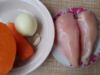 Для начала подготовить все овощи для блюда. Тыкву очистить, помыть и нарезать кубиками. Лук и морковь также очистить, помыть. Лук мелко нашинковать, а морковь нарезать средними кусочками. Чеснок очистить, помыть и измельчить через пресс или натереть на мелкой терке.