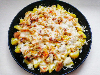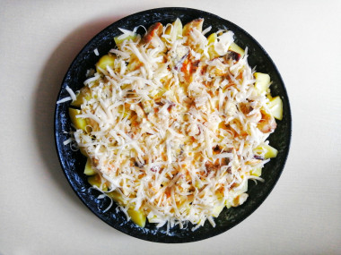 Отваренный картофель выложила в чугунную сковородку, смазанную сливочным маслом. Сверху распределила грибы. От себя добавила натёртый сыр, так как он очень подходит к грибам.