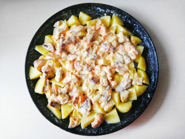 Смажьте кусочком сливочного масла подходящую форму для запекания и выложите на дно весь отваренный картофель. Сверху равномерно распределите обжаренные с овощами шампиньоны в сметане. О том, как выбрать форму для запекания, читайте в отдельной статье по ссылке в конце рецепта.