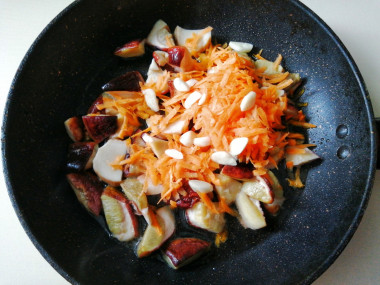Шампиньонов у меня, к сожалению, не было, поэтому заменила их замороженными белыми грибами. Как только они немного оттаяли, нарезала их на средние кусочки, выложила на сковороду с разогретым растительным маслом, немного обжарила. Затем добавила натертую на крупной терке морковь и два зубчика чеснока, которым заменила лук. Жарила грибы до готовности, аромат при этом стоял потрясающий! В конце добавила 2,5 ст. л. сметаны и соль, перемешала и довела до кипения.