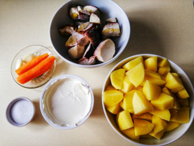Как запечь картошку с шампиньонами в сметане? Подготовьте все необходимые ингредиенты. Включите духовку на 180 градусов. Подготовьте овощи. Очистите и тщательно промойте картофель и морковь и обсушите с помощью бумажного полотенца. Почистите репчатый лук от шелухи.