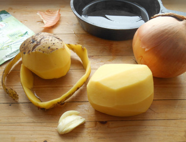 Как сделать картошку в сметане с чесноком? Подготовьте ингредиенты. Сметану берите любой жирности, у меня 20%. Очистите картофель, лук и чеснок, промойте и обсушите бумажным полотенцем. Нарежьте картофель средними кусочками, лук мелким кубиком. Чеснок раздавите плоской стороной ножа и порубите не слишком мелко. Так он не успеет пригореть и передаст свои вкус и аромат картофелю при жарке. Розмарин промойте и обсушите. Свежий розмарин можно заменить сушеным.