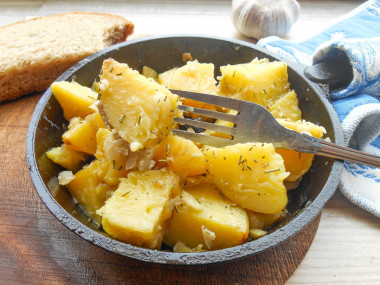 После того как картофель подрумянится, влейте в сковороду куриный бульон (можно заменить мясным или овощным). Доведите бульон до кипения и уменьшите огонь до минимума. Накройте сковороду крышкой и продолжайте тушить картофель ещё около 20 минут, периодически помешивая, пока он не станет мягким. Количество бульона при этом должно уменьшиться в объёме примерно наполовину.