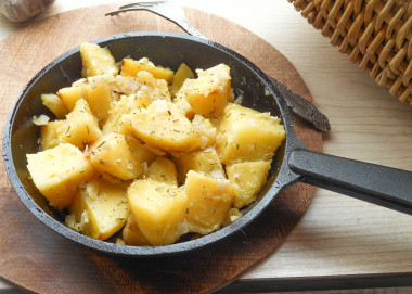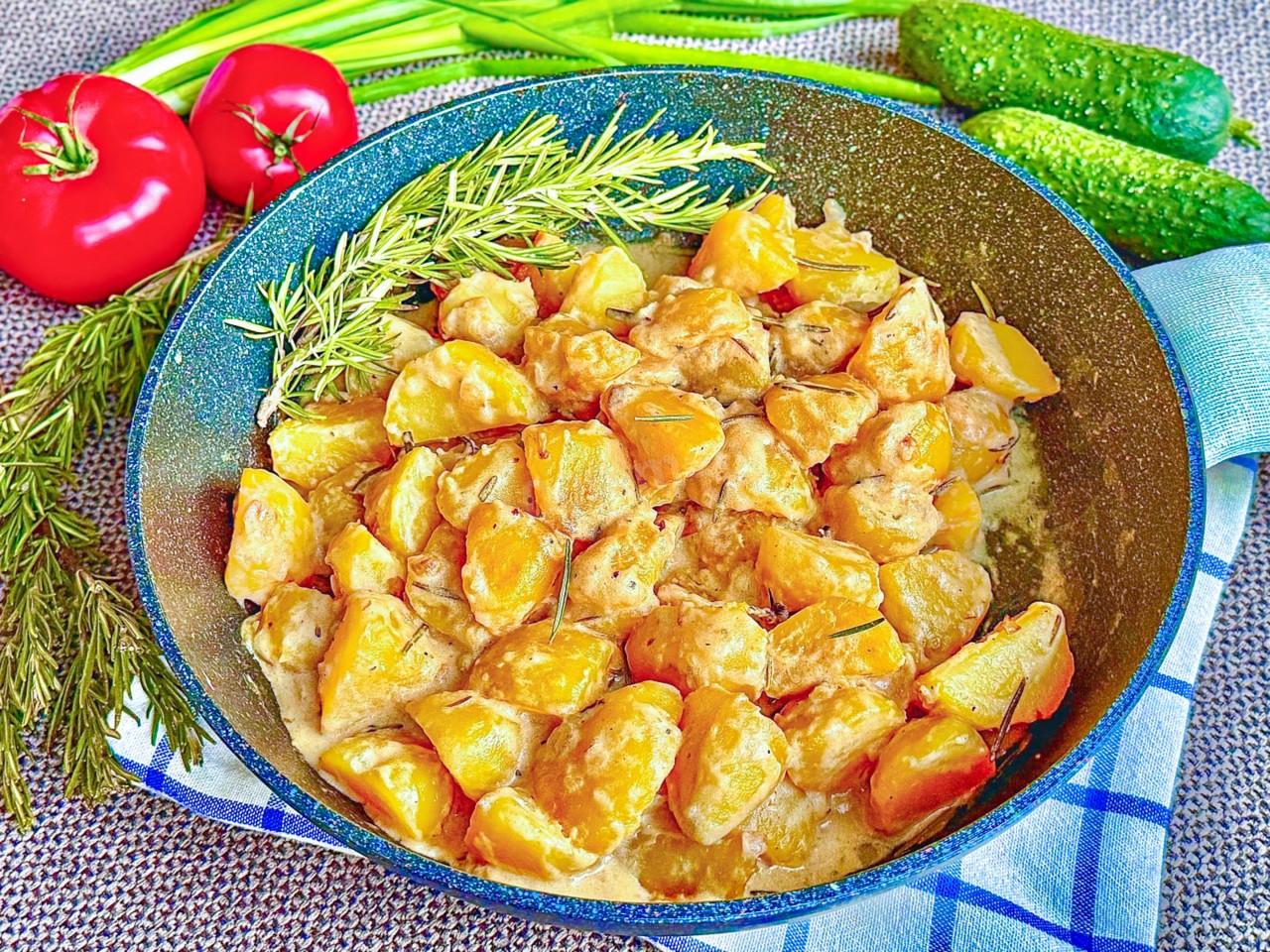 Картошка в сметане с чесноком по этому рецепту получается рассыпчатой и очень ароматной. Я готовила одну порцию, взяла всего две картошки, все ингредиенты разделила на 5. За счёт того что картофель сначала обжаривается на масле, в готовом блюде он хорошо держит форму и не превращается в пюре. Я это поняла когда добавляла сметану, думала что при размешивании так и получиться. К сожалению свежего розмарина у меня не было, пришлось воспользоваться сушёным. Аромат получился восхитительный, особенно в тандеме с луком и чесноком и перцем.