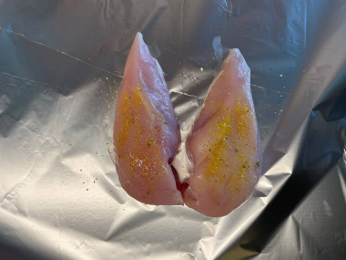 Куриное филе вымойте и также обсушите. Посыпьте мясо солью и перцем, смажьте растительным маслом.