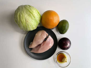 Запечённую курицу, авокадо нарезала ломтиками. Красный лук, нарезанный полукольцами, решила обдать кипятком, чтоб точно не было горечи. Грейпфрут почистила и порезала небольшими кусочками.