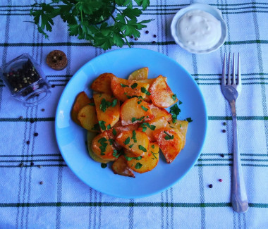 Жареную картошку в сметане я готовила на ужин как самостоятельное блюдо. Картошка вообще универсальный овощ, из него можно много чего приготовить, а в жареном виде это очень вкусно. А если жареную картошку еще и заправить сметаной и немного потушить, то получится новое вкусное блюдо. Я тоже всегда промываю картошку от крахмала и просушиваю полотенцем или бумажными салфетками. Так ломтики получаются целыми и красивыми, с румяной корочкой. Картошка у меня белая, крахмалистая, но во время приготовления она не развалилась, осталась той же формы. Из специй использовала копченую паприку, немного карри и черный перец. Сметану взяла жирностью 15 %, при разведении водой смесь стала жидкой, но в сковороде заправка достаточно быстро впиталась в картошку и еще немного осталось на подливку. В целом блюдо получилось вкусное, с нежным сливочным привкусом. При этом ломтики румяные, красивые. С зеленью картошка хорошо смотрится на тарелке, к тому же петрушка придает свежий, душистый аромат. В следующий раз попробую добавить грибы и побольше сметаны, думаю, тоже получится вкусно.
