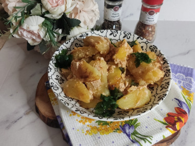 Промытый картофель обсушите чистым полотенцем. Лишняя вода нам ни к чему. Иначе на картофеле не образуется вкусная хрустящая корочка. Для просушивания я заворачиваю кусочки картофеля в полотенце и промокаю несколько раз.