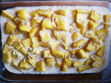 Запекала картофель в сливочном соусе в духовке. Взяла 8 картофелин, нарезала их на дольки. Отварила дольки в подсоленной воде. Через 10 минут попробовала ножом, он легко входил в картошку, которая была уже достаточно мягкой. Выложила картошку в смазанную маслом форму. Поверх нее добавила обжаренный лук и залила сливками. Сыр добавлять не стала. Запекала в духовке до румяной корочки.