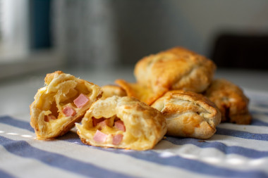 Готовые слойки с ветчиной и сыром немного увеличатся в размере и станут золотистого цвета. Немного сыра может из них вытечь. Извлеките слойки из духовки, немного остудите и угощайтесь. Приятного аппетита!