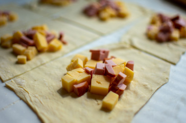 Пласт размороженного слоеного теста немного раскатайте на столе присыпанном щепоткой муки. Разрежьте тесто на 6 квадратов. На каждый квадратик выложите по ломтику ветчины и сыра. Если раскатывать тесто очень тонко, то может получиться и 8 квадратиков. Слоеное тесто можно сделать и самостоятельно. Ссылка на рецепты домашнего слоеного теста есть в под шагами.