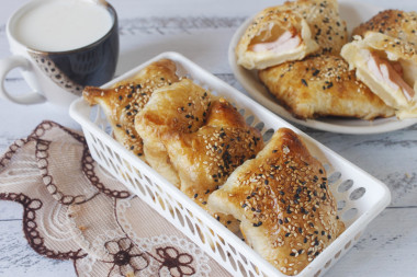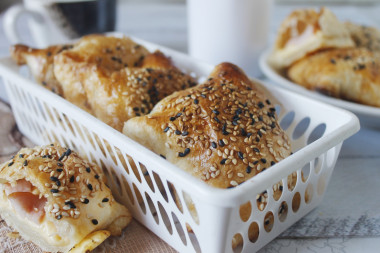 Тесто у меня слоеное, бездрожжевое. Ветчину заменила на докторскую колбасу. Делала из того, что уже было дома, поэтому без кунжута. Для золотистого цвета смазывала взбитым желтком.