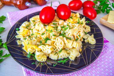 Готовые макароны откиньте на дуршлаг, а после того, как стечет вода, верните в кастрюлю. Пока макароны горячие, закиньте в них сливочное масло, перемешайте.