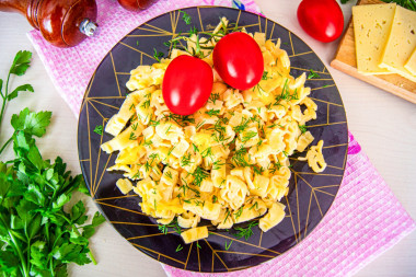 К готовым макаронам добавила сливочное масло, а следом сметану смешанную с натёртым сыром. Из специй взяла только чёрный молотый перец.