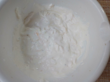 Всыпьте натертый сыр в пиалу, часть оставьте для подачи блюда. Добавьте к сыру сметану, хорошо перемешайте.