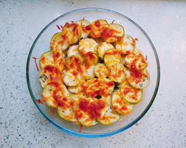 Форму для запекания смажьте растительным маслом. Выложите кабачки внахлест друг на друга.