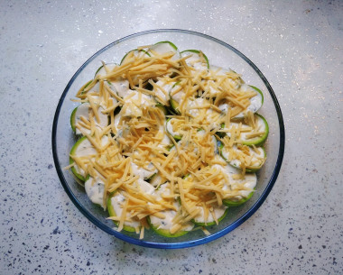 Посыпьте все тертым сыром. Поставьте форму с кабачками в разогретую до 180°С духовку на 20-25 минут. Точное время зависит от особенностей вашей духовки. Приятного аппетита!