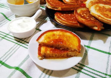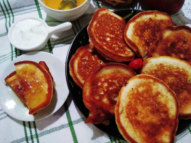 Обжаривайте оладьи до румяности с обеих сторон. Чтобы они пропеклись внутри сковороду можно на пару минут накрыть крышкой. Снимайте оладьи со сковороды и подавайте к столу. Со сметаной, джемом или сгущенным молоком. Приятного аппетита!