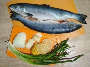 По рецепту "горбуша запеченная с лимоном в духовке в фольге" я приготовила семгу. Продукты взяла все, что указаны в ингредиентах, только базилик у меня сушеный. От себя добавила кольца обычного репчатого лука в начинку. Хвосты и головы у рыбы я отрезала и использовала для приготовления ухи. Рыбу почистила, сёмгу чистить очень легко и быстро, извлекла внутренности, помыла и просушила салфетками. После чего посолила и начинила. Запекала в фольге около 20 минут и ещё минут 10 в раскрытом виде, чтобы рыбка подрумянилась. Тут важно её не передержать в духовке, чтобы готовое блюдо оставалось сочным. Получился замечательный ужин! Очень люблю красную рыбу и всегда рада приготовить её по новому рецепту. Спасибо!