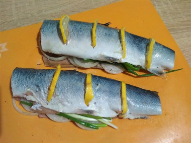 Застелите противень фольгой. На фольгу налейте 1-2 столовые ложки оливкового масла и распределите его по всей поверхности. Начините брюшко рыбы нарезанным зеленым луком, чесноком, листиками базилика и парой кусочков лимона.