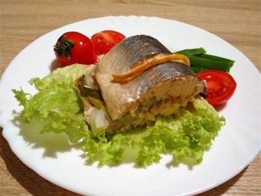 Рыбу тщательно просушите, обрежьте плавники. По желанию можете обрезать и хвостик, я этого не делаю. С двух сторон на тушке рыбы сделайте надрезы через 1-2 см. Рыбу посолите и поперчите со всех сторон, а также внутри. Уделите особое внимание местам надрезов.
