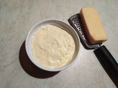 Готовим сметанную заливку. Для этого смешиваем сметану с солью и мускатным орехом. Можно по вкусу добавить сушёные травки – укроп, чабрец. Чесночок чистим и пропускаем через пресс или натираем на мелкой тёрке и тоже добавляем к соусу. Все хорошо перемешиваем до однородности. Соус готов.