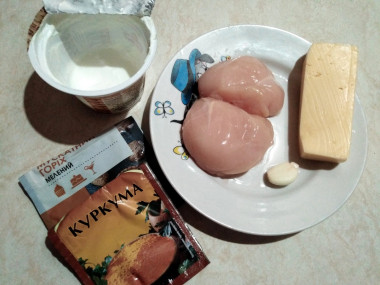 Ополаскиваем и обсушиваем куриную грудку, натираем ее куркумой и выкладываем в небольшую форму для запекания, смазанную подсолнечным маслом. Пусть постоит минут 20, замаринуется.
