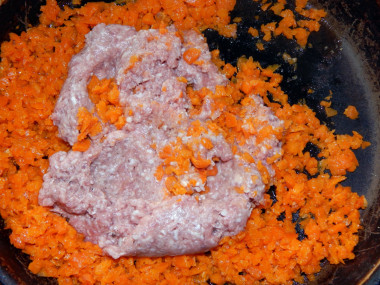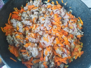 Затем выложите в сковороду подготовленный мясной фарш и перемешайте его с овощами. Обжаривайте все вместе еще 5-6 минут.