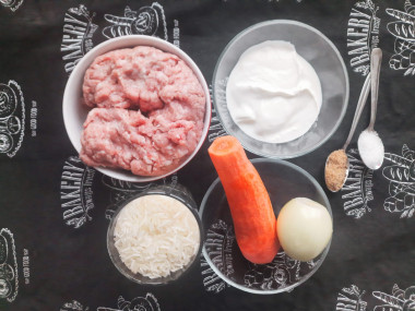 Как сделать рис с фаршем в сметане? Подготовьте для этого все необходимое. Фарш можно использовать из любого вида мяса. Я буду готовить из свиного фарша. Рис берите длиннозерный. Он не будет развариваться так, как, например, круглозерный. Сметана может быть любой жирности.