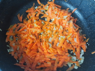 Сковороду для жарки разогрейте до горячего состояния и налейте на неё немного растительного масла. Выложите в сковороду измельченные лук и морковь. Обжарьте их, помешивая, 2-3 минуты.