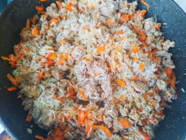 Рис промойте несколько раз в холодной воде. Затем воду с него слейте и выложите рис в сковороду. Перемешайте его с фаршем.