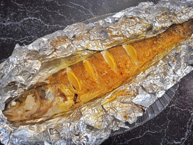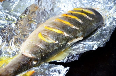 Заверните рыбу в фольгу, поднимая края кверху, чтобы рыбный сок не вытекал. Переложите получившийся конвертик на противень. Поставьте рыбу в разогретую до 200°С духовку и запекайте около 30 минут.