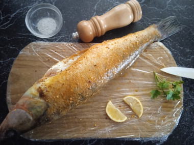 Искала рецепт приготовления рыбы в духовке целиком, чтоб просто и быстро. Рецепт горбуша сочная в фольге в духовке мне понравился. Но купить горбушу не получилось, взяла судака. Вместо базилика взяла свежие веточки петрушки по совету автора. Приготовила рыбку прям, как на фото. Но для красоты блюда оставила голову. Почистила и промыла рыбу. Натёрла внутри и снаружи солью, перцем и приправой для рыбы. Использовала приправу из стерилизованных паром овощей. Также сбрызнула лимонным соком судака. В надрезы вставила ломтики лимона. А во внутрь рыбы положила петрушку и дольки лимона. Запекала судака в фольге в духовке 20 минут при 180 градусах. Затем фольгу раскрыла и готовила ещё 10 минут до румяности. Аромат запечённой рыбы сногсшибательный! Невероятно вкусно вышло. Рыбка с лимоном и специями имеет великолепный вкус. Очень нежное и вкусное белое мясо рыбы. У судака практически нет костей, что очень удачно) Прекрасная рыбка получилась. В фольге судак хорошо протушился в собственном соку и вышел сочным. Ну, очень вкусно! Спасибо))))