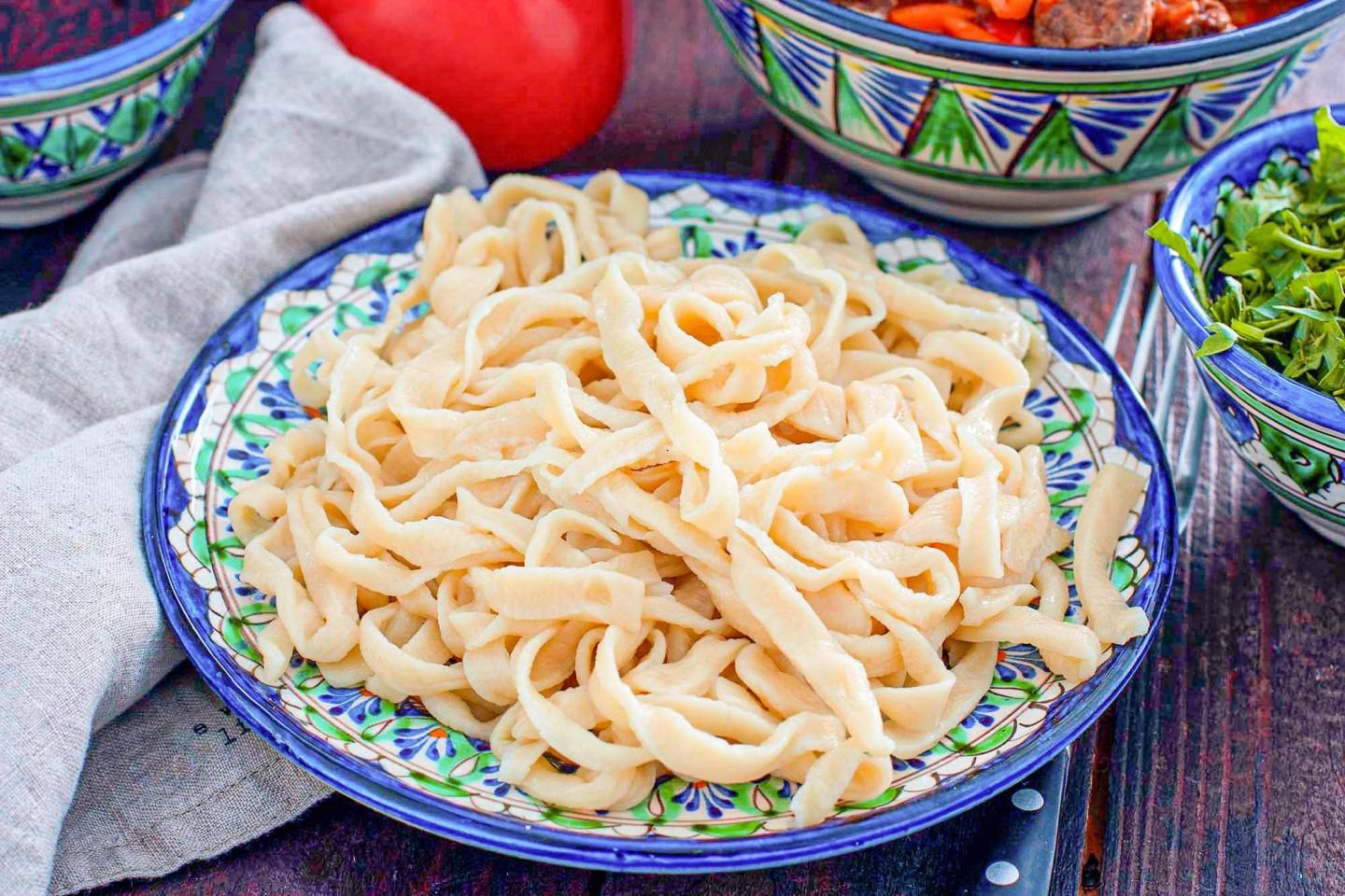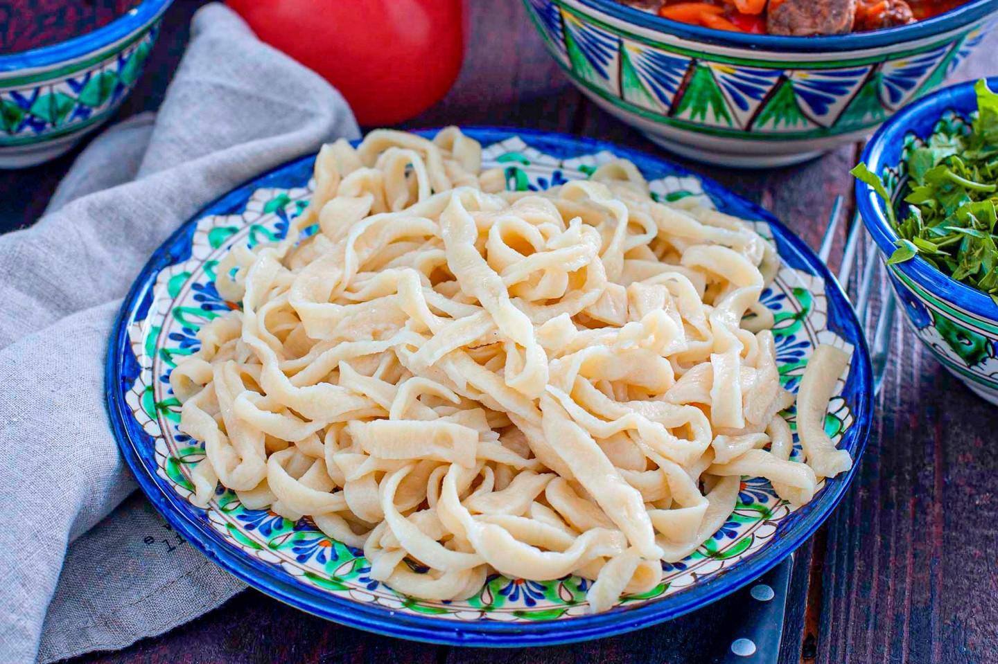 Лагман — блюдо уйгурское, а значит, и лапша должна быть особой. В классическом варианте ее не раскатывают скалкой, а вытягивают руками, перекручивая жгуты в воздухе. Но дома повторить такое сложно. Наш вариант — адаптация для обычной кухни: раскатка и нарезка. Так делают в Казахстане и Киргизии, и это ничуть не хуже вытяжной лапши. А в Узбекистане в тесто для лагмана иногда добавляют куркуму — для цвета.