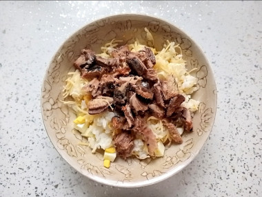 Все хорошо перемешайте. Уберите салат ненадолго в холодильник. Затем подавайте к столу. Можете выложить его при помощи кулинарного кольца. Приятного аппетита!