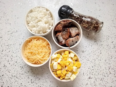 Яйца я отварила заранее, чтобы они остыли и легко нарезались на кубики. Рис для салата выбрала "для плова". Зернышки остаются целыми, но при этом мягкими. Сыр у меня российский, выбирала вкусный. Рыбу поломала на кусочки, удалив хребет. Все заправила оливковым майонезом и поперчила.