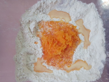 Вылить в муку тыквенное пюре и тщательно вымешивать руками около 10 минут, при необходимости подсыпая немного муки.