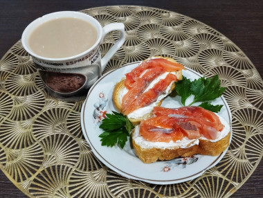 А утром нарезала на тонкие ломтики и выложила на кусочки батона, смазанные творожным сыром.