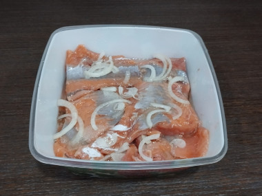 Затем переложила кусочки рыбы в контейнер, пересыпая полукольцами лука и добавляя растительное масло. Закрыла контейнер и убрала на ночь в холодильник.