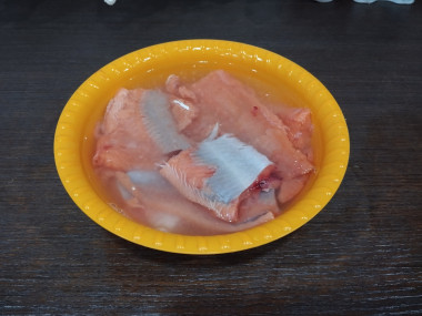 Выложила рыбу в миску, залила водой, накрыла тарелкой, поставила в качестве